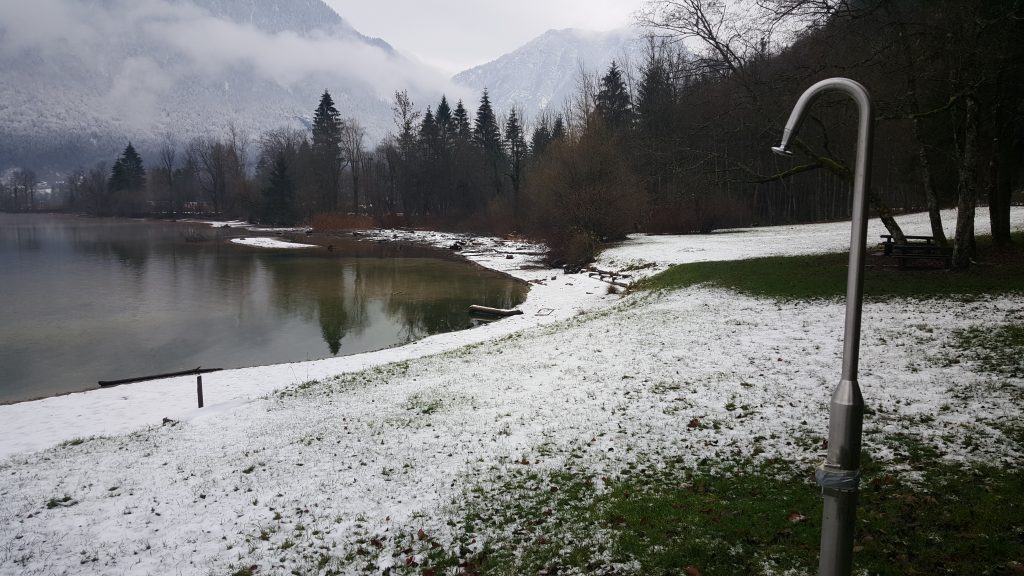 Göl etrafında biraz arabayla dolaşıyoruz. Göl kenarında belirli noktalarda park alanları var. Yüksek sezonda demek ki her şey başka oluyor burada. Hem göl kenarında duş görünce de bu berrak ve nefis göle yazın giriyor olmaları da imrendirmiyor değil…