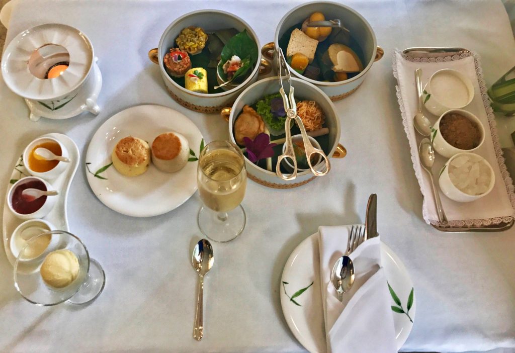 Khao San Road dönüşü otelde bavulları toparladıktan sonra, heyecanla süslenip püslenip, otelin teknesi ile iki yan bina olan Mandarin Oriental’e geçiyorum. Geçmiş 3 yüzyılda pek çok ünlü yazar bu otelde konaklarken aynı zamanda bu çay saatinin olduğu yerde çayını yudumlamış, makalelerini, kitaplarını yazmış. 12:00- 17:30 arası servis veren bu özel bölüme girerken kıyafet şartları var. Mayo, terlik ya da spor kıyafetle girilemiyor, biraz şık olmak gerekiyor diye ben gündüz vakti çekmişim topukluları. Tek başıma oturuyorum. Servis yapan Thailand’lı garsonlar son derece kibar, hafif bir müzik sesi geliyor, beyaz ince detaylar, arada içeri süzülen güneş ışığı. Hakikaten çok özel hissettiriyor insana. Set menüden ben özellikle Thai olanı seçiyorum ki batılıdan uzak farklı yiyecekleri de denemek için. Beğenmeme riski yok diye düşünüyorum. Ama evvelden bir prosecco. Allahım nasıl da şımarık bir gün. Ben bu keyfi yaşarken diğer yandan iki arkadaşım da takside kaybolan cüzdan ile kaldığımız otelin lobisinde uğraşıyorlar. Şımarık ve hain biriyim!