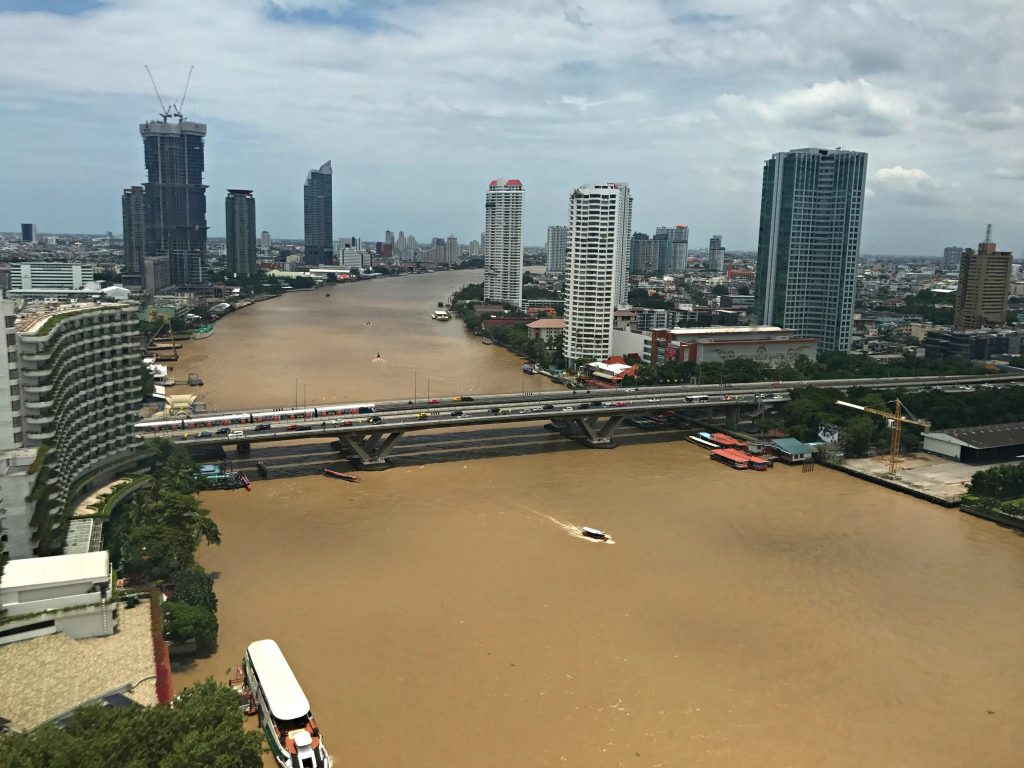 Kamboçya’da terlik çıkarılarak girilen otellerden sonra şimdi şımarma zamanı. Chao Phraya nehri şehri ikiye bölüyor ve bizim otelimiz de nehir kenarında, çamur rengi olsa da manzara gündüz ve gece hep güzel.