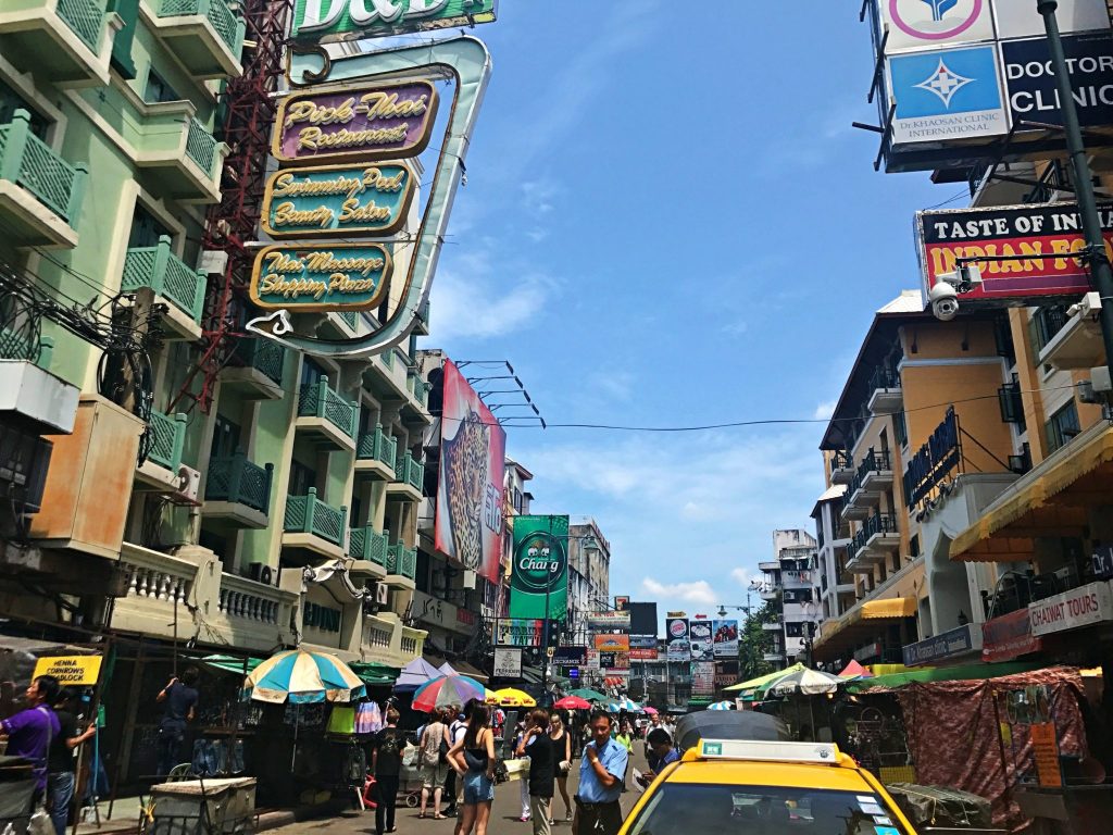3. günde meşhur Khao San Road‘a gideceğiz. Zaman zaman taksi, zaman zaman da Uber kullanıyoruz. Khao San Road, oldukça hareketli bir cadde, ön tarafta barlar, kafeler masaj salonları sıralaması ile arka sokaklarda sırt çantalı gezginler için hosteller, oteller bulunuyor. Uçağımız akşam üzeri, otelden de geç çıkış hakkımız var o nedenle rahatız. Hatta ben öğleden sonrası için çok özel bir yerde çay saati randevusu bile ayarlamışım. Anlatacağım onu da.