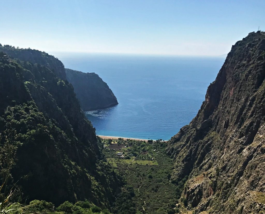 Faralya köyü’ndeki Keyif Motel’in kafesindeki molamız böyle geçiyor. Tam aşağıda Kelebekler vadisi, üç beş keçi, horoz, tavuk ne varsa hepsi aşağıki bahçede.