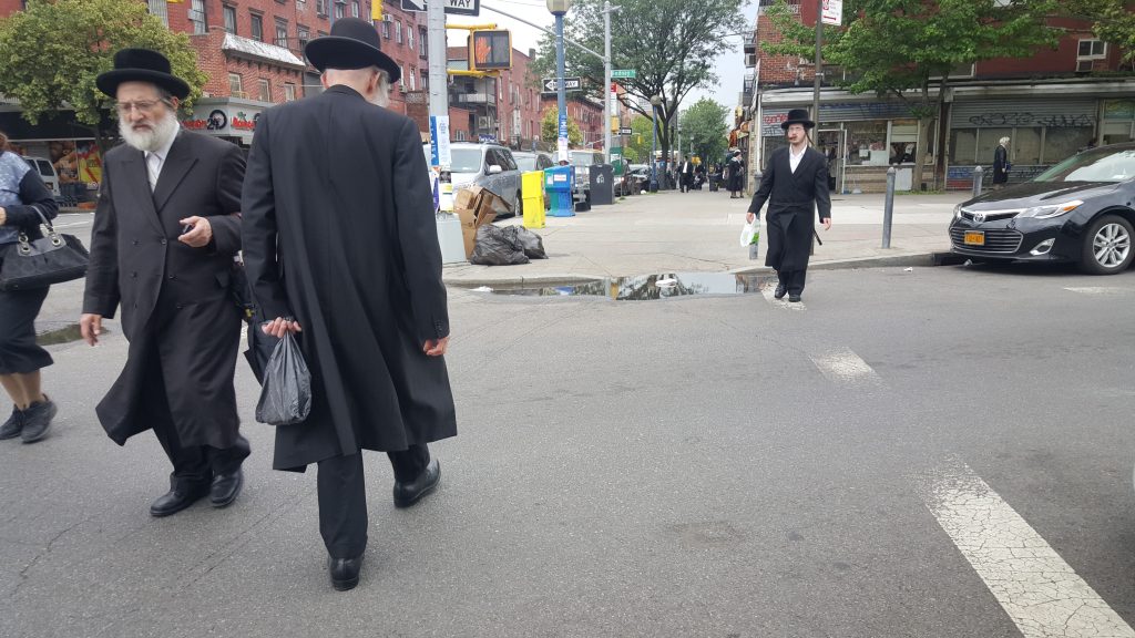 Uzun etekli, küt kesim saçlı ve yaz günü ince çorapları koyu renk ayakkabıları ile kadınlar, siyah bekishe’leri, kippah’ları ve şapkaları ile saçları püsküllü yahudi erkekleri.