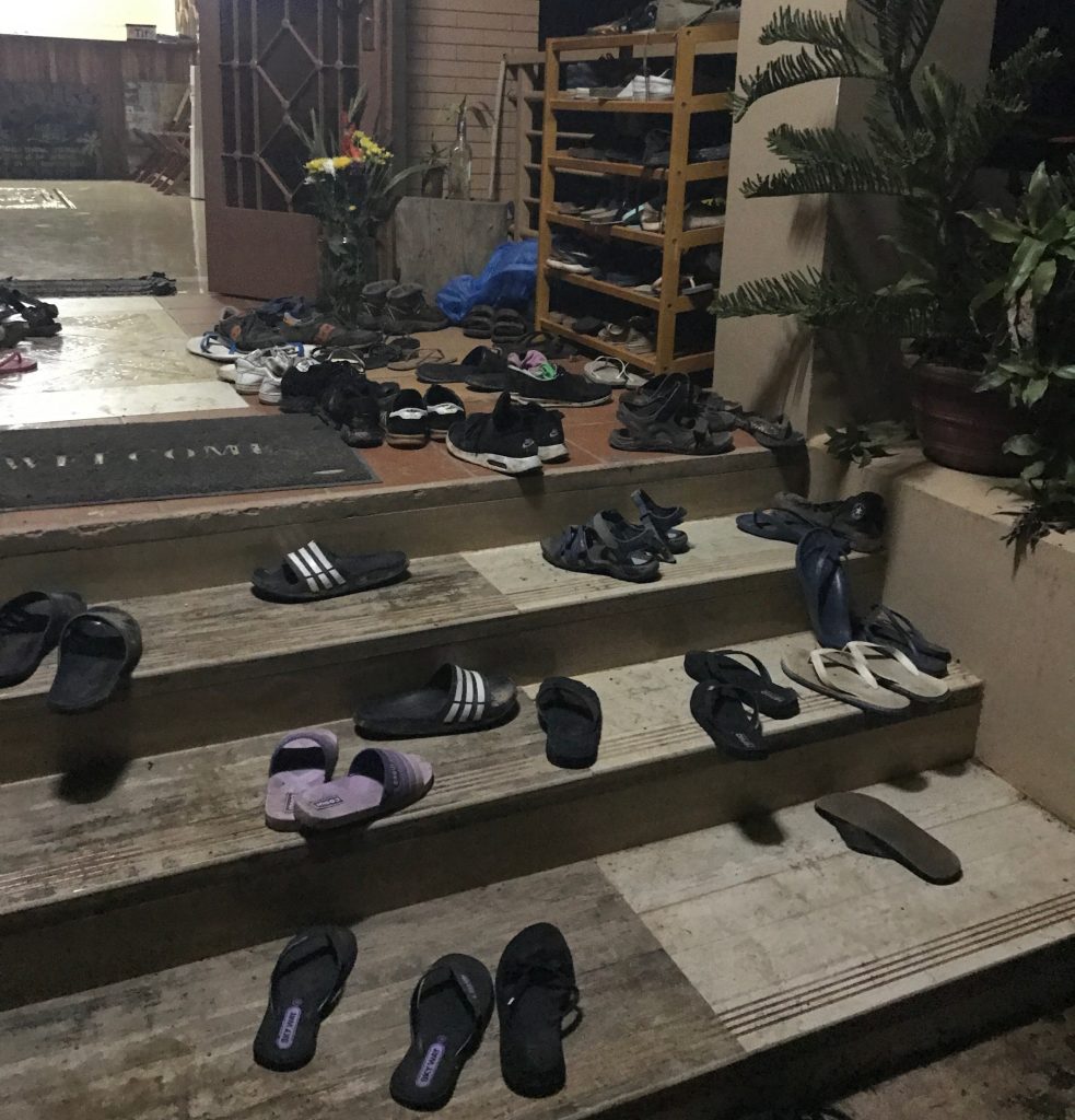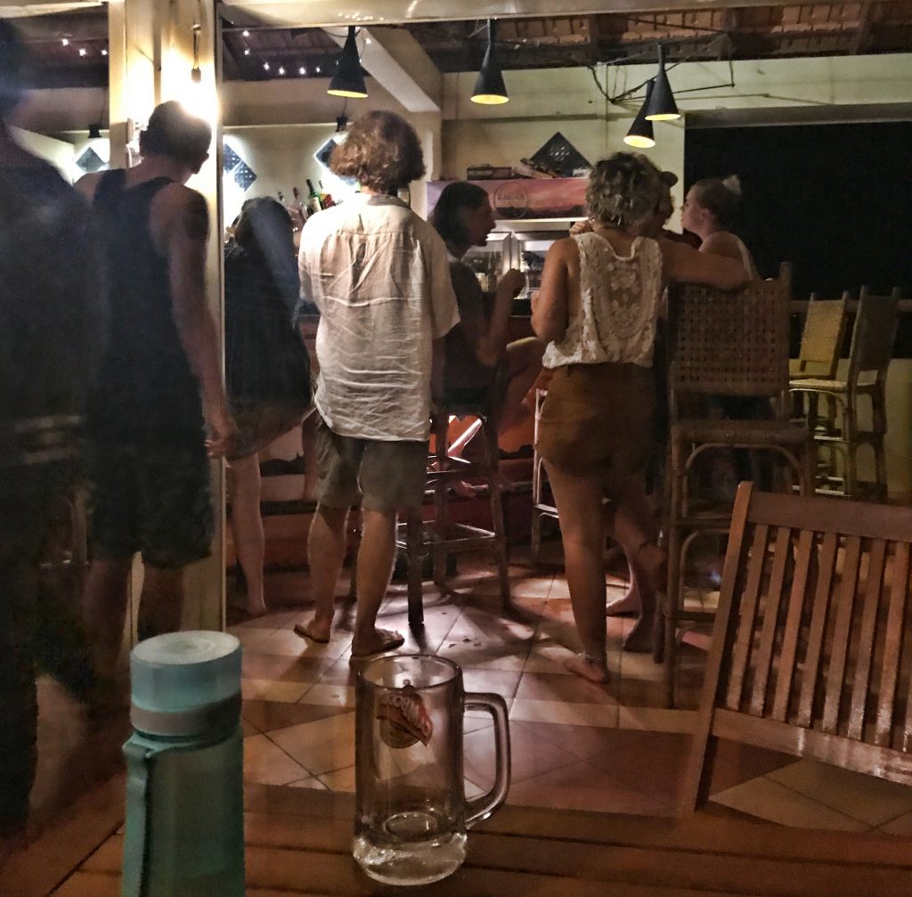 3 katlı bir bina, alt iki kat hostel, çatı katında da bar yapılmış. En alt katta terlikle çıkarılıyor. Neden makyaj yaptım ki ben salak gibi diyorum. Herkes şort, tişört ve yalın ayak, birbirleri ile sohbette, canı isteyen de çıkıp şarkı söylüyor. Asyalı yok hiç, herkes ya Avrupalı ya da Avustralya karasından.
